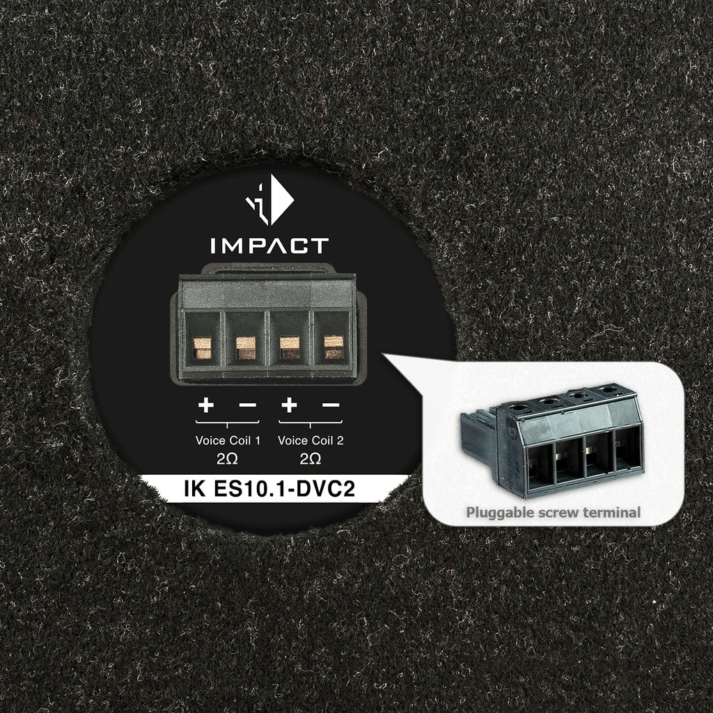 The IK ES10.1-DVC2 is equipped with the 250 mm shallow mount subwoofer IK S10-DVC2. It features a heavy-duty dual voice coil and an extremely rigid sandwich paper cone. This setup effortlessly converts amplifier power into massive sound pressure while also delivering accurate, detailed bass reproduction.